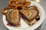 Layers of lean corned beef are piled high and smothered with sauerkraut and swiss cheese topped off with thousand island dressing. Served on marble rye bread.